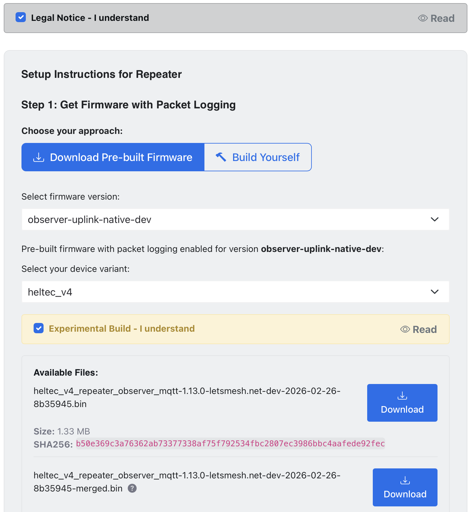 Go to Add an Observer, select the observer-uplink-native-dev option for the firmware once agreeing to the terms, and then select the hardware you will be using. Below is what you see if you're downloading firmware for a Heltec V4: