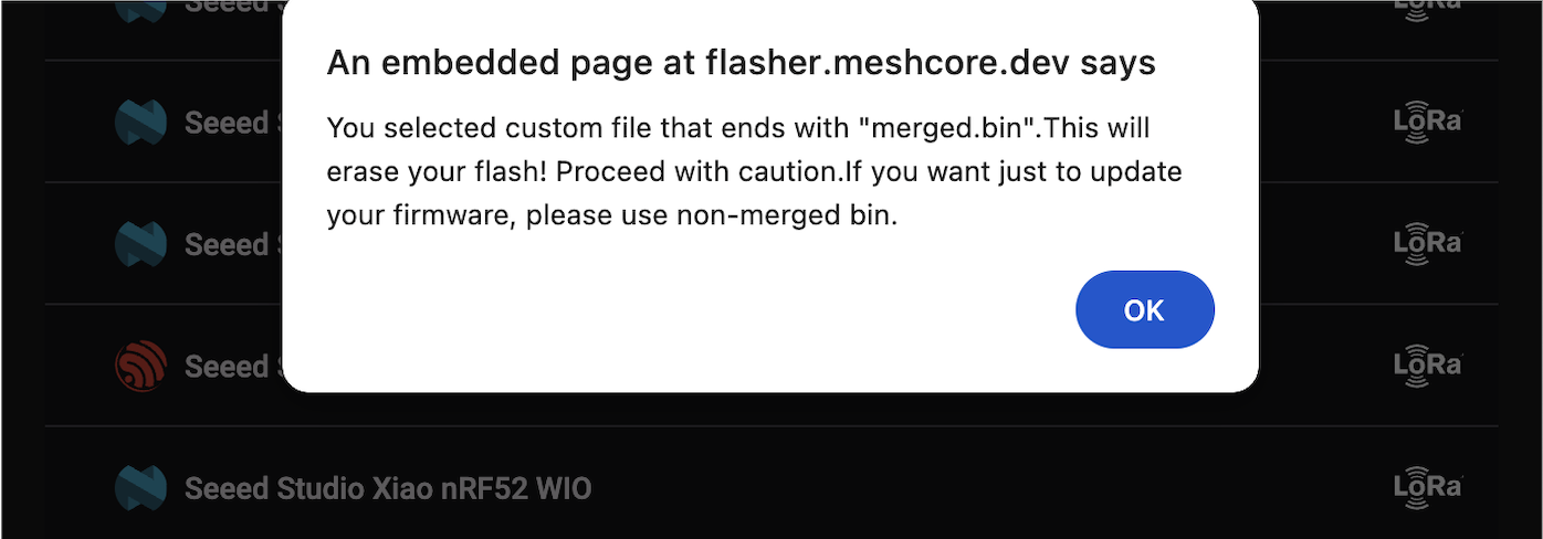 Download the merged firmware (the lower of the two options) - this will fully wipe the device, so when doing future updates, download the one above it. Go to Flasher App and scroll all the way to the bottom and select "Custom Firmware", choose the file you just downloaded, and OK the warning about erasing the device.