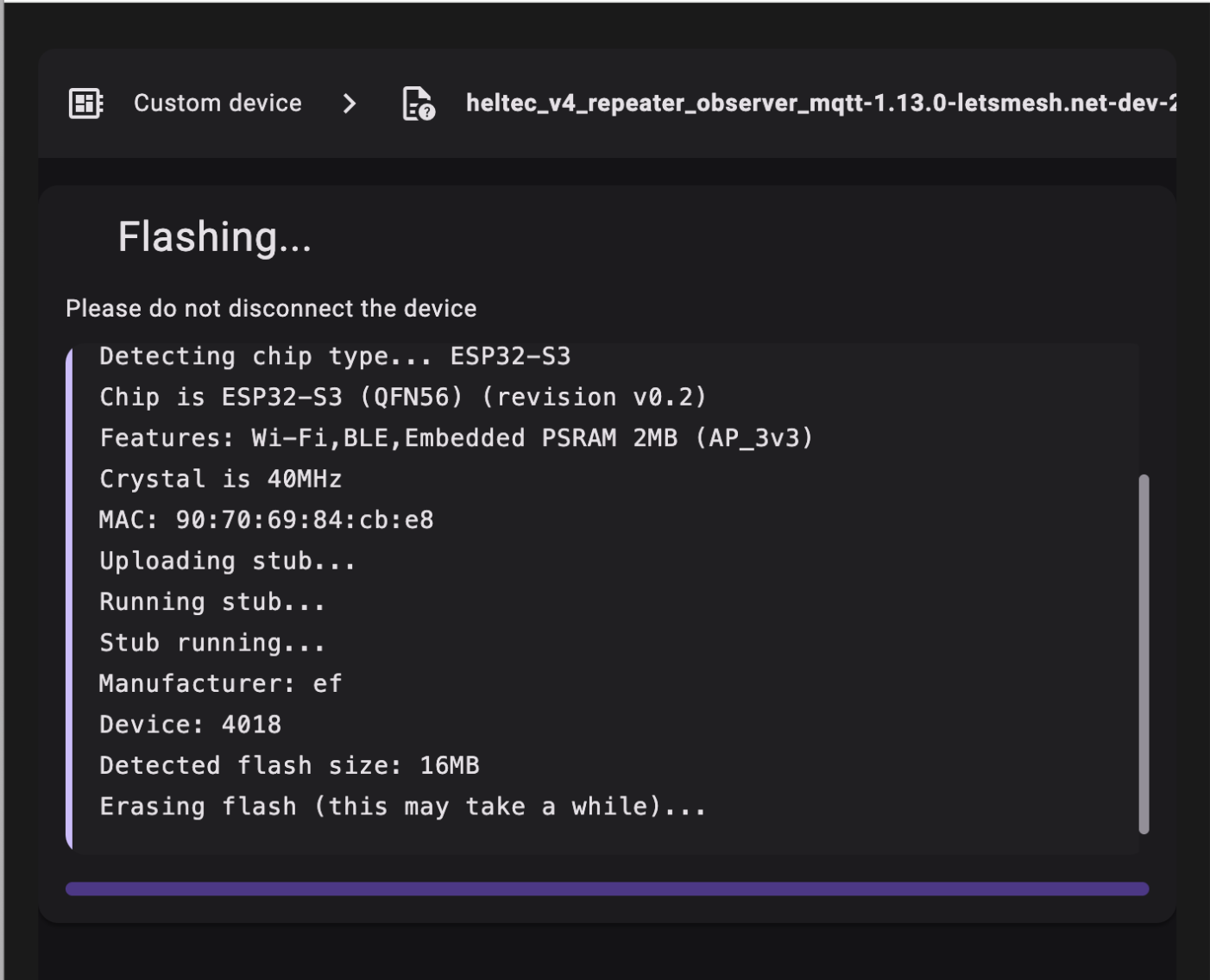 Push the ⚡️Flash! button and wait a while for the device to be completely wiped and a new firmware to be applied.