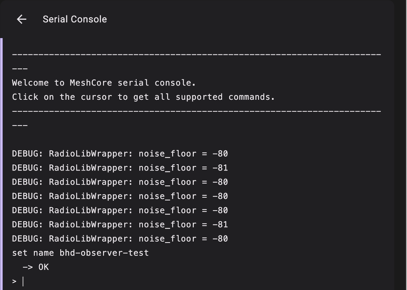 Here you can do things like set repeater name, admin password, and other CLI Commands supported over bother serial and application interfaces. Since there is a lot of text to paste, doing the first part of the setup over serial is a little easier. First rename the device from MQTT Observer to something like: <region>-location-observer-handle and an Admin password:
